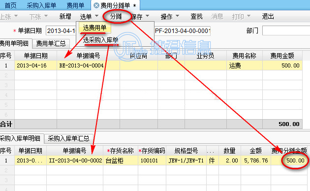 直接在采購入庫單-工具-費(fèi)用單,新增的費(fèi)用如果有“進(jìn)行分?jǐn)偂睂傩?,那么該費(fèi)用單生效時(shí),系統(tǒng)會(huì)提示“是否自動(dòng)分?jǐn)傎M(fèi)用到對(duì)應(yīng)單據(jù)”,如果選擇是,那么系統(tǒng)會(huì)將有“進(jìn)行分?jǐn)偂睂傩缘馁M(fèi)用按費(fèi)用檔案上的分?jǐn)偡绞剑ò磾?shù)量或按金額)分?jǐn)偟讲少徣霂靻紊?,自?dòng)生成一張費(fèi)用分?jǐn)倖巍?/SPAN>