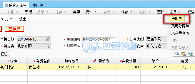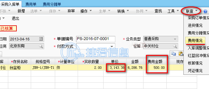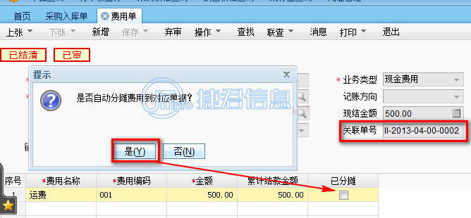 4.1手工分?jǐn)?/SPAN> 選擇對(duì)應(yīng)的費(fèi)用單有采購入庫單,點(diǎn)“分?jǐn)偂卑粹o,如果有多張采購入庫單,則根據(jù)金額自動(dòng)分配填寫分?jǐn)偨痤~。 4.2自動(dòng)分?jǐn)?/SPAN> 選擇“是”將自動(dòng)分?jǐn)?/SPAN> 分?jǐn)偨Y(jié)果查看: 分?jǐn)偤蟾膶懭霂靻未尕浫霂靻蝺r(jià): 可在入庫單上聯(lián)查相關(guān)的費(fèi)用情況。 5.生成憑證: 注意事項(xiàng): 詳情咨詢山東濟(jì)南用友軟件營銷服務(wù)中心--捷君信息,為您服務(wù)!
